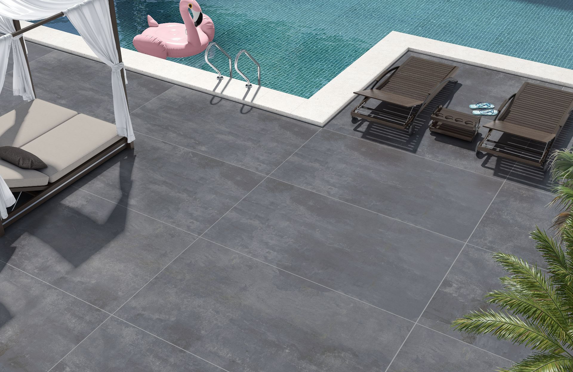 Havuz kenarında döşenmiş doğal ahşap görünümlü Albero dış mekan yer karoları.